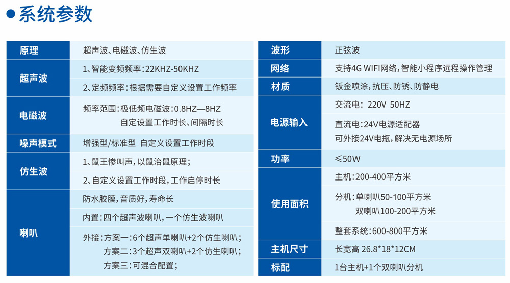 采用超聲波、電磁波、仿生波原理,是復(fù)合型多功能產(chǎn)品,主機(jī)內(nèi)置4個(gè)超聲波喇叭+1個(gè)仿生波喇叭,可外接6個(gè)超聲波喇叭+2個(gè)仿生波喇叭。功率50W,聲壓強(qiáng)、分貝高,可滿足大面積復(fù)雜環(huán)境使用,多工作模式,在無(wú)人時(shí)段或區(qū)域可啟用噪音模式、仿生模式,可提高驅(qū)鼠效率。
